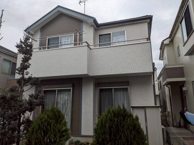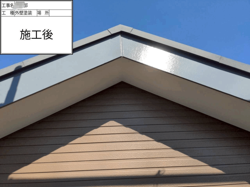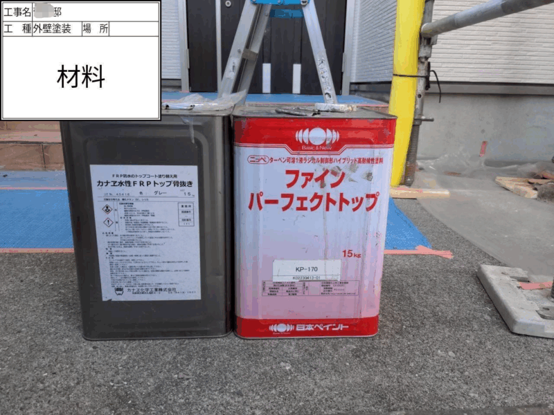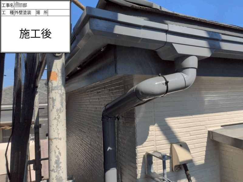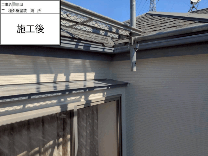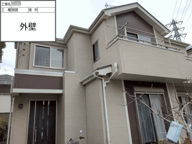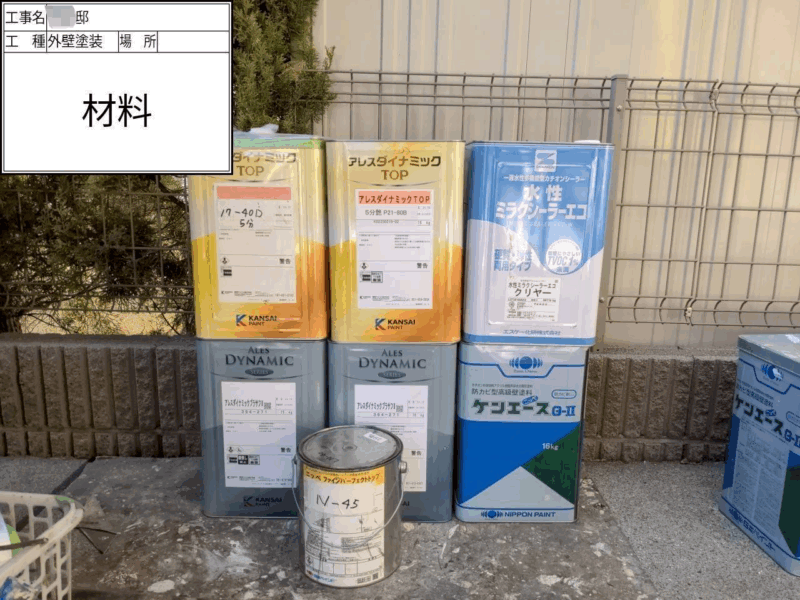 | 使用した塗料 | 外壁塗料(関西ペイント) 下塗り(アレスダイナミックプラサフ) 中上塗り(アレスダイナミックトップ) 付帯部 破風(ファインパーフェクトトップ) 軒天(ケンエース) 雨樋(ファインパーフェクトトップ) 鉄部(ファインパーフェクトトップ) ベランダ(カナエ化学:カナエFRPト ップ) |