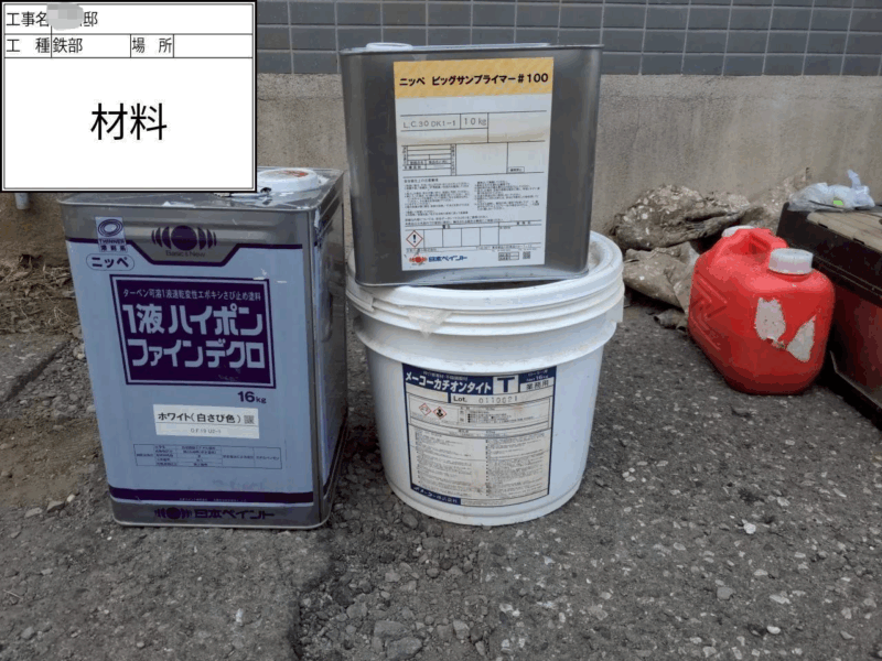 | 使用した塗料 | 鉄部(日本ペイント) 下塗り(ハイポンファインデクロ) 中上塗り(ファインSi・防錆形) 床(トップコート) |