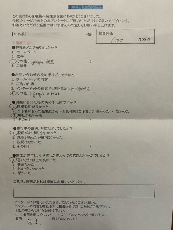 国分寺市で外壁屋根塗装工事のご依頼がありましたI様からアンケートの回答を頂きました。